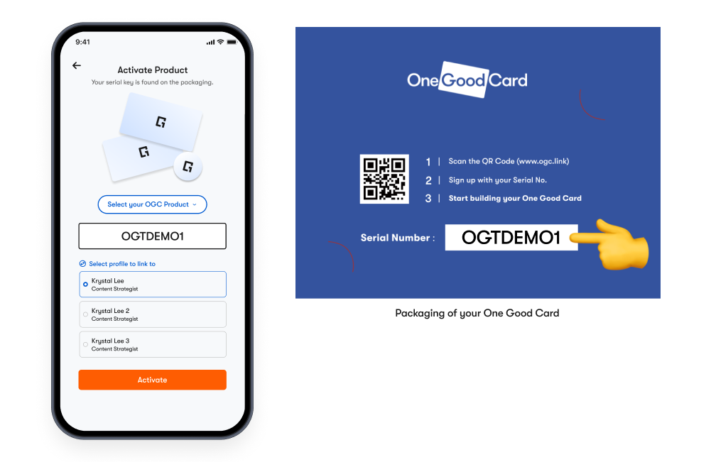 Log in to your One Good Card account, click Activate, select your product type, enter the serial number, choose your profile, and click Activate. Your product is instantly linked and ready to use.