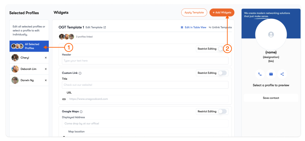 Widgets control how information and actions appear on each digital business card. With bulk editing, you can: