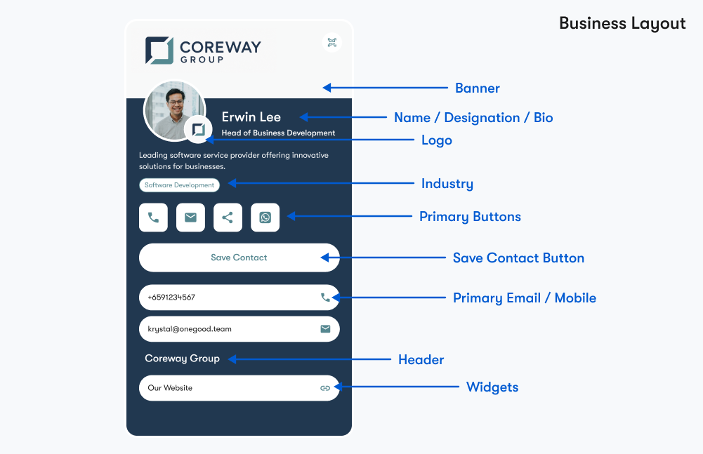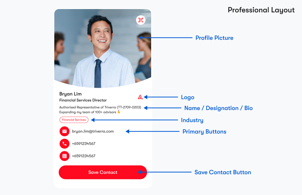 A bold, brand-forward layout that puts your company identity front and centre. The Business layout is ideal for representatives who want their card to lead with the brand before the individual.