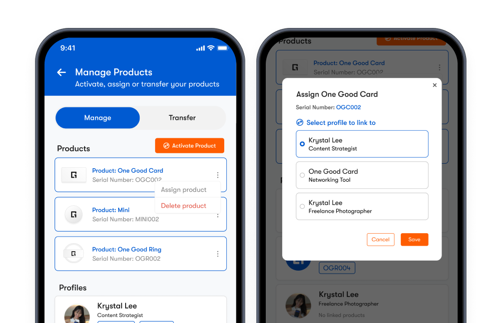 If you have multiple One Good Card digital profiles, you can manage and assign your One Good Card products to different profiles. This is useful if you are managing multiple products and profiles for different use cases or businesses.